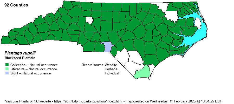 | Identification | This is the familiar broad-leaved member of the genus, as the several basal leaves ascend or spread from the plant base on petioles 1-2 inches long. The blade is widely elliptical, strongly parallel-veined, about 4 inches long and 2 inches wide. The several scapes grow to about 8 inches tall, with the spike of tiny flowers covering the upper 50-60% of the stalk. The bracts are short and thus the spike is quite narrow, usually less than 1/4-inch wide. No other native Plantago is similar, though the non-native P. major, infrequent in the state, is similar; that species has ovoid to globose capsules, about 2-4 mm long, whereas P. rugelii has capsules longer and ellipsoid in shape, about 3-6 mm long. | |