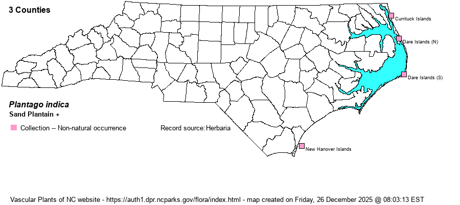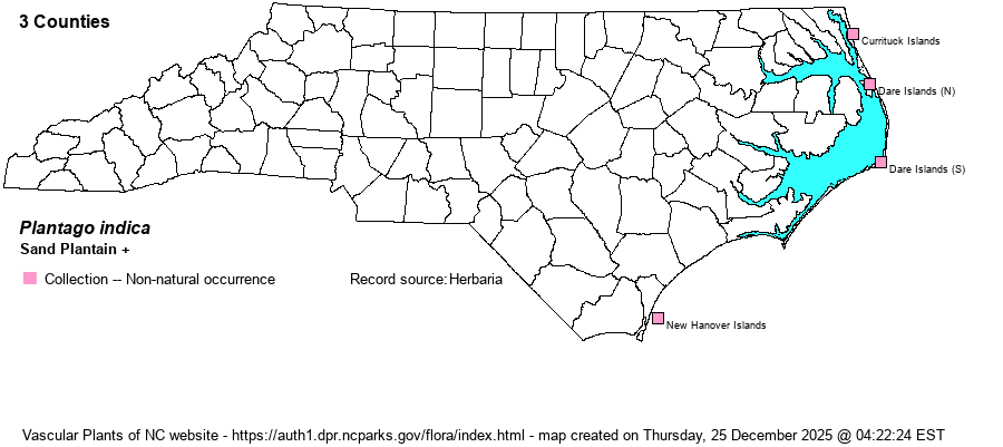 | Plantago indica | ? | Plantago arenaria | Flora of North America (1993b, 1997, 2000, 2002a, 2002b, 2003a, 2004b, 2005, 2006a, 2006b, 2006c, 2007a, 2009, 2010) | | | Plantago indica | = | Plantago psillium | Radford, Ahles, and Bell (1968) | , orthographic variant | | Source: Weakley's Flora |