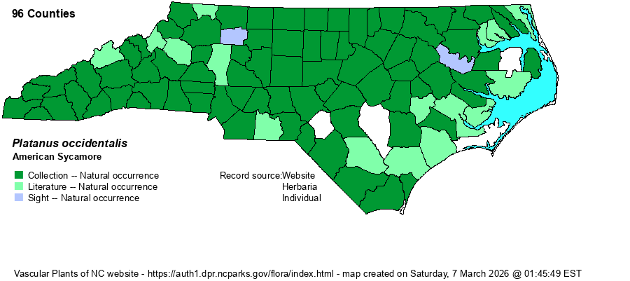 | Habitat | This is a wetland species seldom far from water, growing most often along stream and river banks, but also is present in floodplains, and in drier swamps. It grows well in clearcut wetlands, where it is somewhat of a pioneer woody species of brownwater wetlands. American Sycamore is also planted as an ornamental (historically at least), and a number of county records may pertain to local escapes to roadsides and field borders rather than to natural wetlands. |