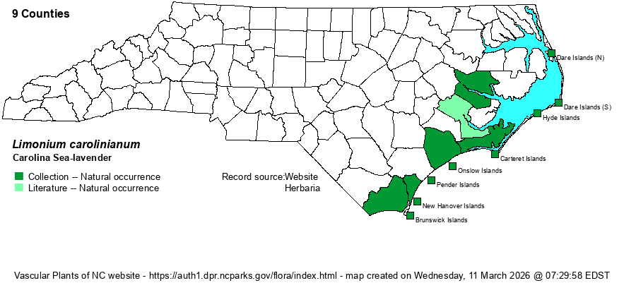 | Taxonomic Comments | Some references treat Limonium as having several species in the Southeast, or at least several varieties/subspecies. RAB (1968) listed two species with two varieties for each, but Weakley (2018) and some others feel that it is best to treat it as a "polymorphic L. carolinianum".