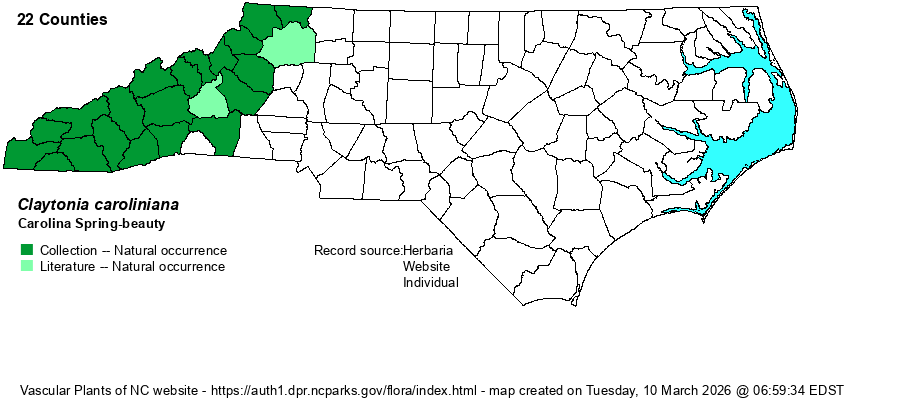 | Identification | This is a familiar spring ephemeral wildflower of the state's higher elevations, more so above 4000 feet. It has a single stem, generally erect to leaning, but only about 6-8 inches tall, with only a few stem leaves. These are opposite, lanceolate to elliptic, about 2 inches long and 2/3-inch wide, with a distinct petiole. In this species, the blade is wide enough that the petiole is clearly noticeable; in C. virginica, the leaves are linear and the petiole is essentially not noticeable. Both species have a short raceme at the end of the stem, of 6-20 flowers, only a few in bloom at a time; each has white to light pink petals, with pink veins, that are elliptical and spreading, and the open flower is about 1-inch across, reasonably large for the small size of the plant. In this species, the petals tend to have strong enough pink to red veins such that the petals normally have a pink tint at a distance. Thankfully, both species grow in dense patches, and many a rich forest floor has one of these two species carpeting parts of the ground. | |