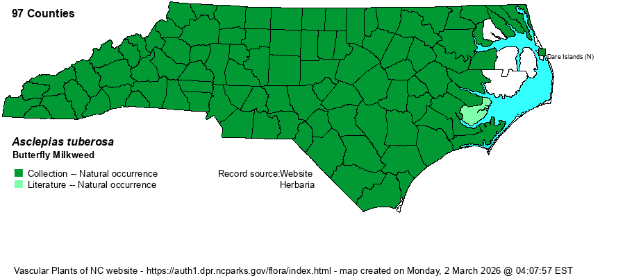 | Other Common Name(s) | Butterflyweed is often used, more so than Butterfly Milkweed. However, NatureServe uses Butterfly Milkweed, and it seems better to use a group common name included in the names of all of the others in the genus, rather than using an idiosyncratic name, if an alternative one is available (and it is). Pleurisy-root and Orange Milkweed are occasionally used. | |