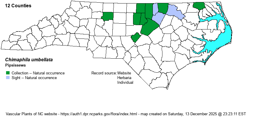 | Distribution | Quite limited in the state, compared with Chimaphila maculata. It is found only in the northeastern Piedmont (with the exception of a collection in Forsyth County), and very sparsely in the extreme northern Coastal Plain near the VA border. Shockingly, there is not a single photo of this species on iNaturalist for the state, and the last collection date in SERNEC is 1991.