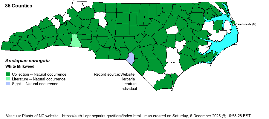| Abundance | Frequent to common over the Mountains, Piedmont, and most of the Coastal Plain; infrequent in the lower Coastal Plain, toward the coast. Next to A. tuberosa, this is our most widespread milkweed in the state. | |