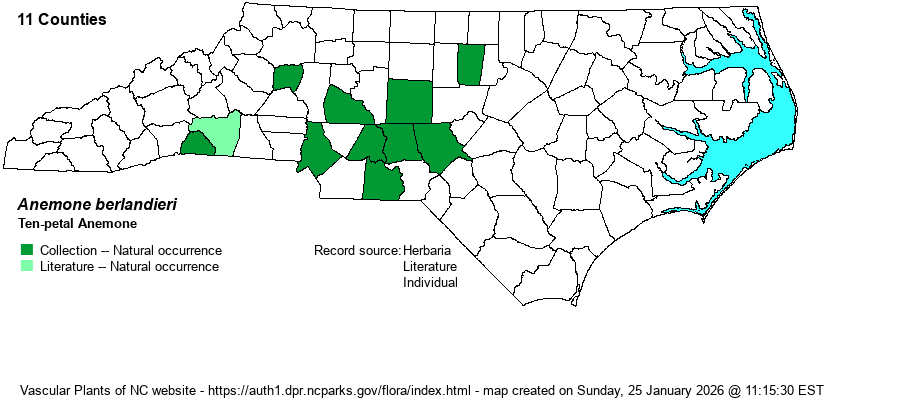 | Identification | This is a small herb, growing to about 1 foot tall; it is quite pubescent. It has a few basal leaves that are divided into three leaflets; and on the unbranched stem, just above the middle, grow about three narrowly divided leaves (in a whorl), each leaf typically with entire margins but about 5-9 segments/lobes. The key points are that the cauline (stem) leaves are above the midpoint of the stem, and these leaves are very different in shape from the wider basal leaves. In the somewhat similar A. caroliniana, the whorl of stem leaves are attached below the middle of the stem, and these stem leaves have fairly wide segments and look fairly close to the basal leaves. A. berlandieri has a large (for the size of the plant) and solitary flower at the top of the stem, facing upward, with around 10-12 narrow white sepals (which appear as petals), and producing a flower about 1 inch across, with a green "cone" in the middle. A. caroliniana tends to be quite a bit shorter in NC, and the flower is smaller and most importantly, the stem leaves are closer to the ground and are somewhat similar to the basal leaves. You are not likely to accidentally run across either of these two species, as both are very rare in the state. But, A. berlandieri is quite a striking species when in bloom in its "stark", dry and rocky slope habitats. | |