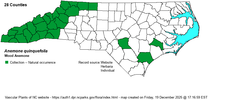 | Identification | This is a slender, rather frail, herb that ranges only to about 6 inches tall. It has several basal leaves, and each is strongly cleft into 3-5 sections ("leaflets"); if 3, then the lateral sections are at least moderately cleft so as to appear almost split. On the upper part of the stem is another set of 2-3 very similar strongly-cleft leaves, though somewhat smaller in size. About 1-2 inches above these leaves is the solitary flower -- consisting of 5 bright white sepals that are elliptical and rounded at the tip, about 1 inch across when fully opened. This species is obviously confused with two other species; the low elevation A. lancifolia, which has the leaves cleft into 3 segments, but the lateral leaflets are seldom cleft/divided into even partial sections. Weakley (2018) points out additional, and probably stronger, characters: A. lancifolia has the terminal leaflet/segment lanceolate or ovate (broadest at or below the middle) and serrated on the margin to below the middle, and the sepals at least 15 mm (3/5-inch) long, producing a flower about 1.3 inches across. A. quinquefolia has leaflets broadest at or above the middle (elliptic, oblanceolate, or obovate), serrated only above the middle, and sepals less than 15 mm (3/5-inch) long. Quite a few plants seem to remain in vegetative condition all spring, not flowering; however, there should be at least a few flowers in the patch that will bloom. The species does not grow singly, but typically in patches that can be several square meters. When this species is in bloom, you might think it is easily seen; but it almost always grows in highly diverse sites with several dozen other spring-blooming wildflowers that are also competing for your attention! You could walk past a patch in bloom if there are taller or more strikingly flowered species nearby. | |