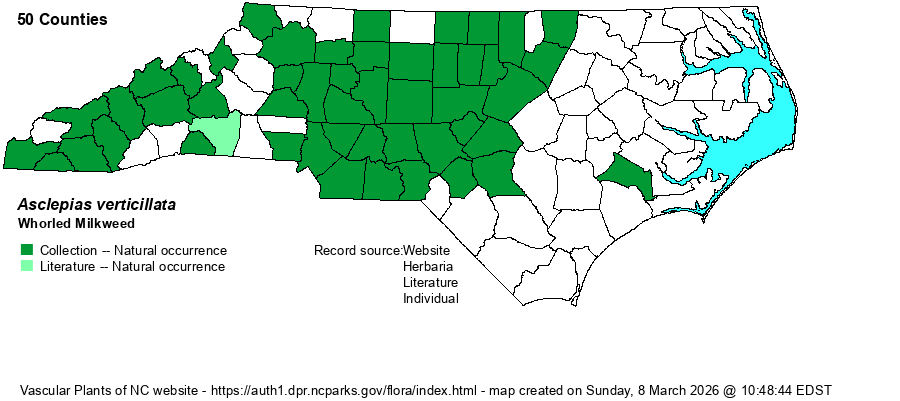 | Identification | This is a quite slender milkweed, growing only to about 1.5 feet tall; there may be a few small branches in the upper nodes. It has numerous very slender, linear leaves, not paired as in other milkweeds but in whorls of 3-6 leaves at a single node. Each leaf is 1-2 inches long and needle-like; thus, the vegetative plant has very little leaf surface and can be almost invisible amid grasses and other herbaceous plants unless in bloom. The flowers occur in several dense ball-like clusters from upper axils, each about 1.5 inches across. The flowers are pale greenish-white, leaning to off-white, and not at all striking at much distance. Nonetheless, this is a milkweed worth knowing for its unusual whorls of several needle-like leaves, rather than for its flowers or overall stature. It can grow in small colonies, but even so such colonies are not large and do not attract attention from much distance. Fortunately, it is widespread in the western 2/3rds of the state and should be a fairly familiar species to biologists. | |