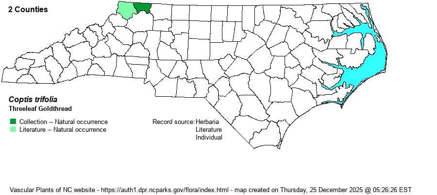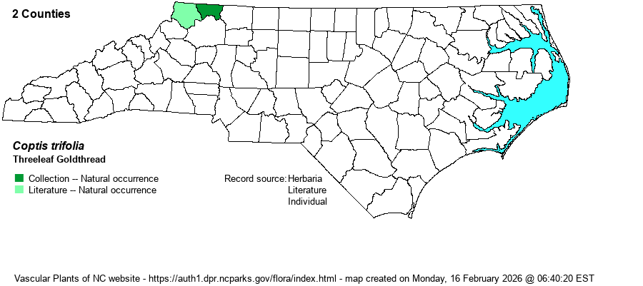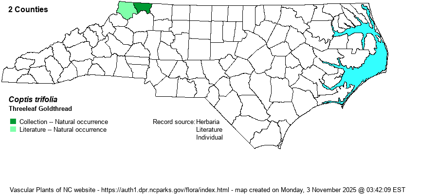 | Identification | This is a tiny species, with the several leaves divided into 3 leaflets, reaching only about 4 inches tall -- with the petioles being the lower 3 inchesof the leaf. Each leaflet blade is rhombic to fan-shaped, like with some hawthorn (Crataegus) leaves, very serrated on the margins, shiny, dark green, and evergreen -- only about 1-inch long and wide. One or two flowers emerge on naked stalks from the base, ranging up to 4-6 inches high (higher than the leaves), with the solitary flower having 5-6 white sepals; each sepal is elliptic in shape, but the spread flower is only about 1/2-inch wide. This species can be confused with one to several unrelated species, particularly Rubus hispidus, which can grow in the same habitat. That species has evergreen and 3-parted leaves (3 leaflets), but those leaflets are elliptical (rounded) in shape, and though serrated, the leaflets are longer than wide, with strongly parallel veins. Coptis leaflets have branching veins on the upper surface, and the distal end of the leaflet is quite jagged and almost lobed; also, the leaflets are as wide as or wider than the length. Needless to say, you must look very closely for this species, maybe even on hands and knees, to examine small evergreen-looking species with tri-foliate leaves. As it is so tiny, it could certainly "hide" along other shaded damp sites in the northern mountains. | |
