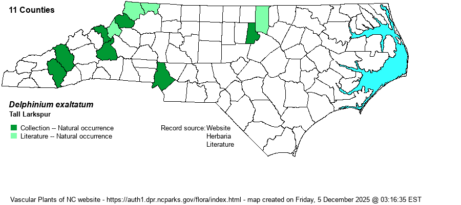 | Identification | This is one of the more spectacular flowering plants in the state, and owing to its great rarity, is a very memorable day to see it in bloom. It is a sturdy/robust herbaceous plant, erect to more often leaning, and reaching 5-6 feet tall. It is a glabrous plant, with some branching in the upper portions. The alternate leaves are widely scattered, with each being strongly dissected into 3 or 5 slender and jagged lobes, each lobe being 2-3 inches long and rather narrow. Several other plants have similar deeply cut/dissected leaves, but few or none on a 5-6-foot-long stem. At the top of the stem, or several branches, is a very long raceme of large blue flowers; the raceme can be 1 foot long or more. The several dozen flowers are not all in bloom at the same time, but each is quite striking, with a long spur extending in the back, and 5 spreading "petals" in "front" -- producing a complex flower about 1 inch long. See website photos to understand the flower shape and structure. If you are lucky enough to find the species, you will certainly be taking photographs, but you should not collect any individuals, as this is a State Threatened species. It is best seen on some of the Amphibolite Mountains in Ashe and Watauga counties. | |