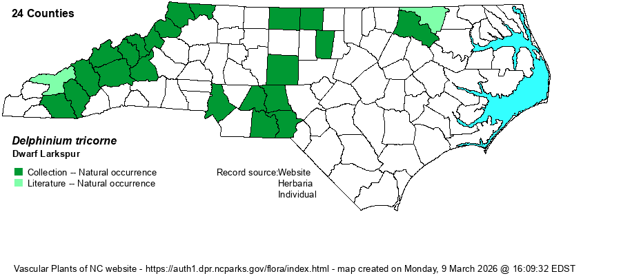 | Identification | This is a beautiful spring wildflower, both for its odd-looking flowers and for the rich violet flowers, a color not often seen in rich forested habitats. It is a medium-sized plant, growing to 1-2 feet tall. It has several basal leaves, each on stalks up to 6 inches long, with the blade being highly dissected into 3-7 narrow segments, each blade being 3-4 inches across. These leaves looks fairly similar to those of D. exaltatum and Aconitum uncinatum and A. reclinatum; and thus in parts of the range you may need to see the flowers to be certain of the identification. The inflorescence, usually just one per plant, is on a separate stalk to about 2 feet tall, having 5-15 scattered but rich violet (to often just white) flowers. Each flower is 1-1.5 inches long, with a long and narrow spur in back and 4-5 spreading "petals" in front; see photos online for better details. This species often grows in spectacular stands of dozens to at times over 100 plants on a given slope, and if in full bloom, the violet colors make a vivid impression on the observer! Some populations, however, have all or mostly all flowers off-white instead of violet. Although some references say the flowers are "blue", maybe the authors have never seen the species in life, the species really has blue flowers in other states within the range, or their concept of "blue" versus "violet" is different from most other people's concept! | |