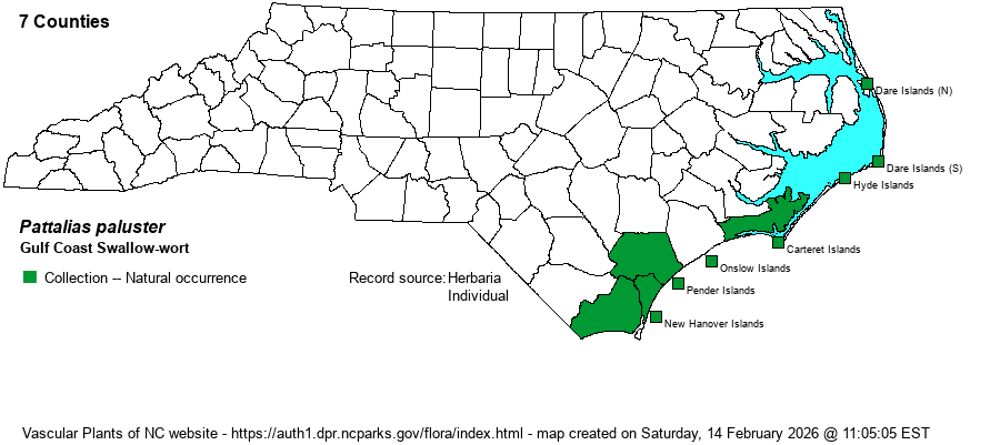 | Taxonomic Comments | This species seems to have its name changed every decade or two! It has normally been placed in the genus Cynanchum, and many references still inlcude it there. RAB (1968) had its name as C. palustre, but most references have or had it named as C. angustifolium. It briefly was placed into the genus Seutera as well. Weakley (2018) gives reasons why it should be moved into the genus Pattalias. Not surprisingly, Weakley (2022) had the name changed from palustre to paluster!