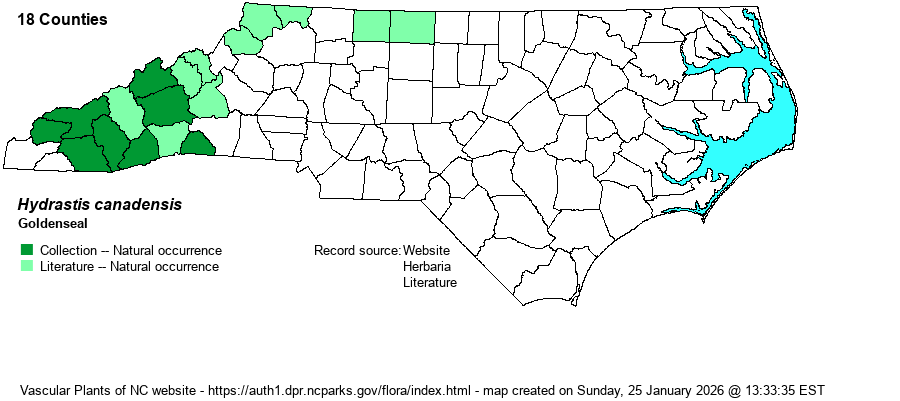 | Identification | This is an herb that grows to about 1 foot tall, with one basal and two stem leaves, which come off the stem near the summit. Each leaf is palmately-lobed into 5 segments, and is about 6 inches wide and almost as long. The margins are serrated, and the leaves are noticeably wrinkled, at least during flowering, and less so later during fruiting. The single flower is at the top of the stem, a few inches above the leaves, which are oriented somewhat horizontally. The flower has no petals, and the sepals drop early, leaving numerous white stamens to represent the flower, to pollinating insects. Each flower is about 1/2-inch across. The fruit consists of a small head of multiple berries, dark red in color. The species is noted for its bright golden-yellow rhizome, which gives the species its common name. This plant is unfortunately often collected for the medicinal usages of the root, and locations of colonies need to be protected from the public. It does grow in fairly sizable colonies, though there are only a few such sites for it each in each county, on average, in the western part of the state. This is a monotypic genus, there being no other Hydrastis species. | |