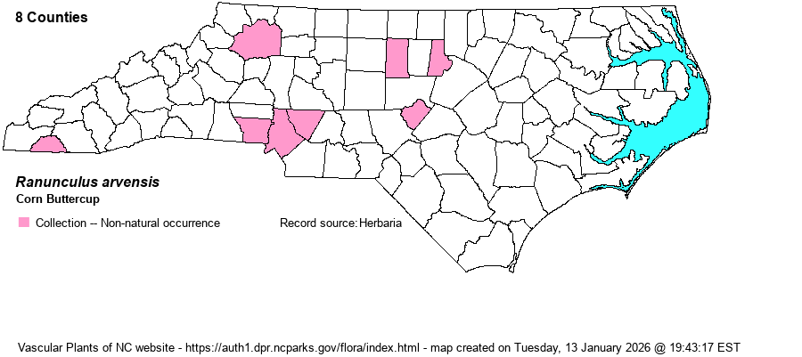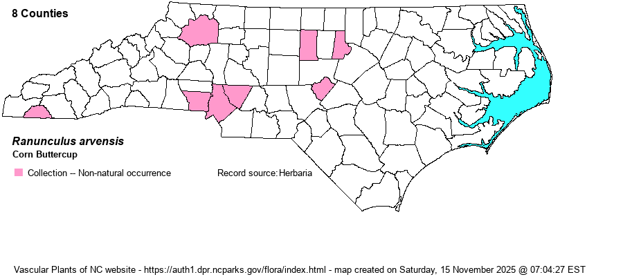 | Identification | Corn Buttercup is best identified by its papillose seeds (tiny bumps) and smallish bright yellow flowers -- about 2/5-inch across. The seed beak is more than 2 mm long (vs. less than 2 mm long in R. sardous). All leaves -- basal and cauline -- are strongly dissected. | |