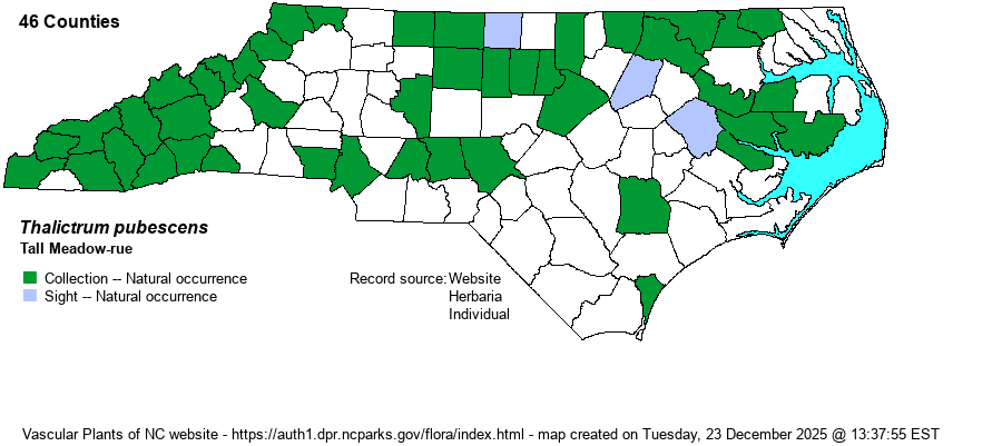| Identification | This is a quite tall species, growing to 4-5 feet tall. It is very similar to, and easily confused with, T. amphibolum, which can grow in similar habitats. Each has mainly bi-ternately divided leaflets (3 groups of 3 leaflets), each leaflet having mainly 3 lobes with the middle the widest, and lobes rounded. In this species, the leaflet undersides do not have small glands (visible with a hand lens) but are somewhat pubescent. Both have sessile stem leaves, and both have large and open panicles of small flowers -- male on one individual plant and female on a separate plant. In this species, the white filaments on the male plants radiate in all directions into a showy ball of white color, as opposed to in T. amphibolum, where the filaments on the male flowers droop, like with T. dioicum. T. coriaceum generally has wide leaflets with several teeth on each leaflet lobe, instead of 3 smoothly rounded lobes; and T. macrostylum normally has many leaflets that are entire and unlobed, plus most leaflets are narrower than 1/2-inch wide. Individuals of tall meadow-rues can often be seen on various walks, but normally you must look carefully at the leaves and flower parts to be certain what you have. | |