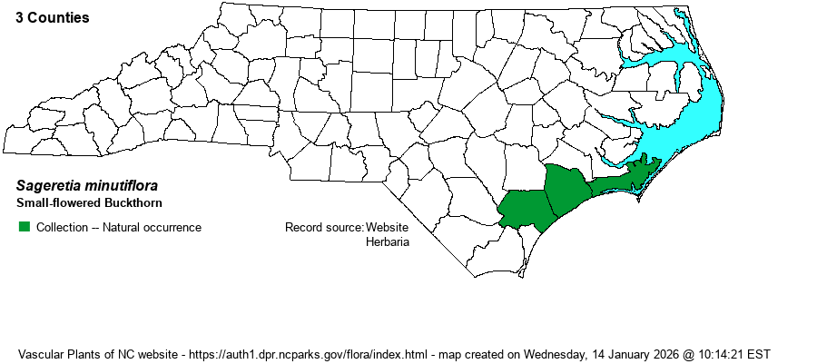 | Identification | This is a “strange” woody plant that is vine-like but is actually a leaning shrub with many short, thorn-like branches. It grows to about 9-10 feet long; typically there are several such stems present so that the plants can form a tangle over other shrubs or saplings. The leaves are deciduous and opposite, but they are thick and glossy dark green, giving a somewhat evergreen look. They are quite small, being ovate in shape with wavy margins and grow only to 1-1.5 inches long. The species has a long terminal cluster of very small white flowers followed by small black “berries” (drupes) that can remain into the winter. However, in NC the species is not often seen blooming or fruiting. It can be confused with Yaupon Holly (Ilex vomitoria) if one looks only at the leaves, as both have quite small, dark green, and thick leaves; but the holly is a widely branching shrub with alternate leaves, whereas Sageretia is a narrow shrub that appears in the field to be a leaning vine. Some people might confuse Sageretia with some type of privet (Ligustrum spp.), as these non-native plants have opposite leaves. However, privet species tend to have much longer branches that are not somewhat thorn-like. | |