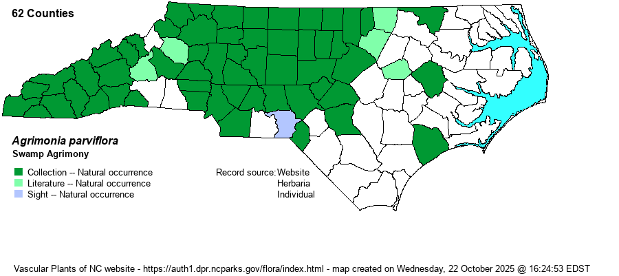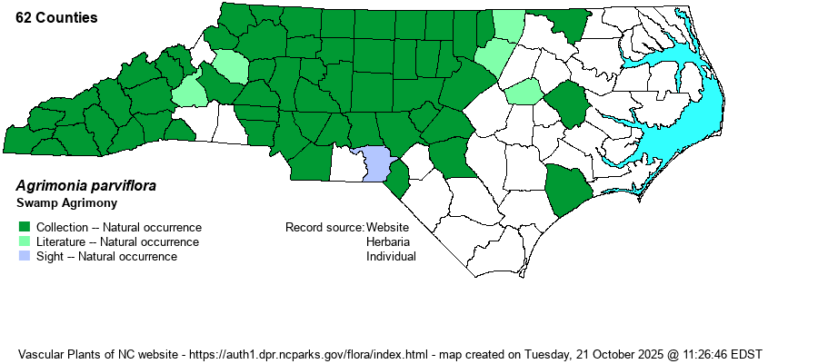 Habitat | This is essentially the only Agrimonia that favors wetlands. It grows in rich soil of bottomland forests, swamps, marshes, wet thickets, and wet meadows. It favors some light gaps in forests and is not normally seen in deep shade. It also prefers higher pH soils. | |