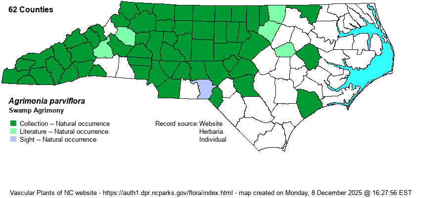 | Habitat | This is essentially the only Agrimonia that favors wetlands. It grows in rich soil of bottomland forests, swamps, marshes, wet thickets, and wet meadows. It favors some light gaps in forests and is not normally seen in deep shade. It also prefers higher pH soils. | |
