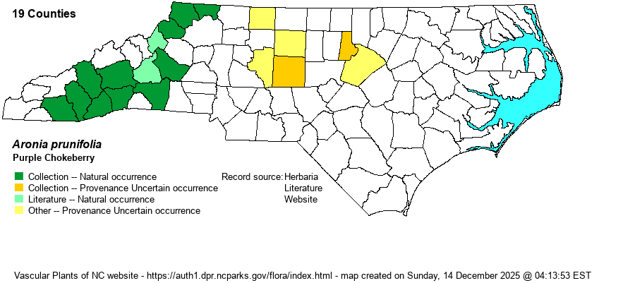 | Abundance | Uncommon or occasional in the Mountains, but it is suspected that it is mostly overlooked if not in fruit, as some references do not treat this as a valid or full species. Presumed to be very rare to rare in the Piedmont, and of uncertain provenance. Nonetheless, it is certainly rarer than the other two chokeberry species in the state. This is an NC Watch List species. | |