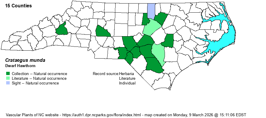 | Taxonomic Comments | Though this species, as with most other NC Crataegus species, was first described around 1900, it languished within C. flava for most of the 20th Century (such as in RAB 1968). In recent years, C. flava has been split up into numerous species, of which one is C. munda.
