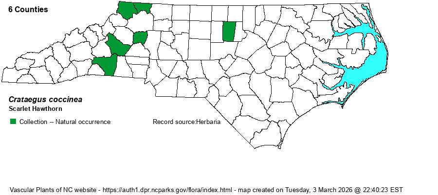 | Distribution | Mainly in the northern half of the Piedmont and the extreme northern Mountains. Unlike with most of the other Crataegus maps on this website, the map below is believed to be essentially accurate, as this is a long-standing full species. SERNEC specimens from Rutherford and Burke counties, both at UNC-Charlotte, are hopefuly correct. A specimen from Robeson County is actually C. marshallii (herbarium PEMB).