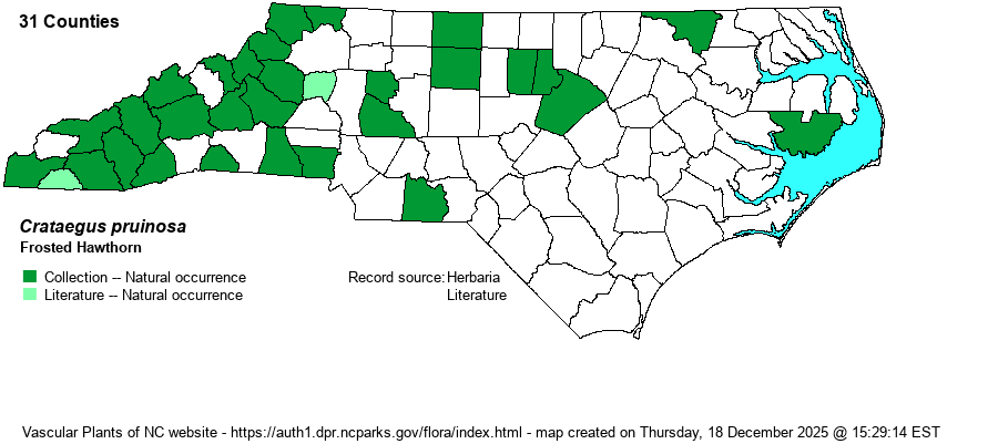 | Taxonomic Comments | Lance (2014) indicates that four varieties occur in the state – var. pruinosa, var. gattingeri, var. dissona, and var. rugosa. Weakley (2018) considers var. gattingeri to be a full species – C. gattingeri [Gattinger’s Hawthorn], but he does consider the other three as variants in the state, with the nominate var. pruinosa as the most numerous one. RAB (1968) mentions C. pruinosa and C. rugosa [as species] but as being subsumed in the very large catch-all C. flabellata.