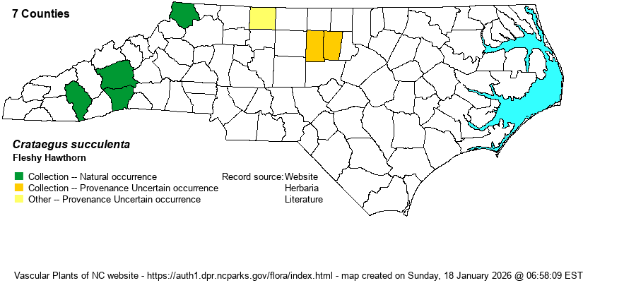 | Taxonomic Comments | Several varieties have been named, and two occur in NC – the nominate var. succulenta, found south at least to Buncombe County, and var. neofluvialis, found mainly along and close to the New River in NC and VA (but probably also at high elevations). Unlike with most of the Crataegus species now considered as valid species in NC, this was one of 13 listed as good species in RAB (1968), though at that time it was only known from Ashe County. Sadly, its range in the state has been expanded very little through new discoveries in recent decades.
