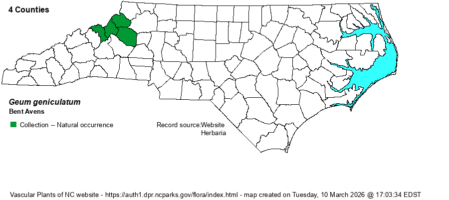 | Identification | This species has an erect stem to about 2 feet tall, generally quite hairy. The basal leaves are fairly large and pinnately divided, with a large tripartite leaflet (or set of 3 leaflets), with small pairs of leaflets along the rachis. Stem leaves are mostly 3-parted. The top of the stem is branched, with single flowers on the many branch tips. In this species, the 5 petals are pink, flesh, or white in color, rather square-shaped (wider than long), and slightly longer than the sepals. The spread flower is about 1/2-inch across, but most distinctive is the drooping flower stalk, such that flowers are usually facing sideways or downward. The sepals are very hairy, and the entire flower and when in fruit seems to have a "fuzzy" look. The large, dissected leaves with leaflets, and the drooping flowers, should make this an easy species to identify when you are hiking near the tops of Roan or Grandfather mountains. | |
