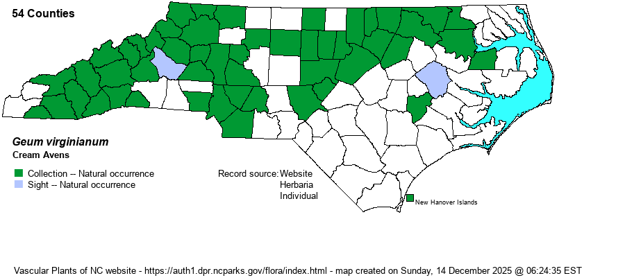 | Abundance | Declining, perhaps strongly. Formerly fairly common to frequent in the Mountains, and infrequent to locally fairly common in the Piedmont, but rare to uncommon in the northwestern Coastal Plain. Seems to have declined in recent decades, as it can be difficult to find in most of the state now. It is much less common than is G. canadense. | |
