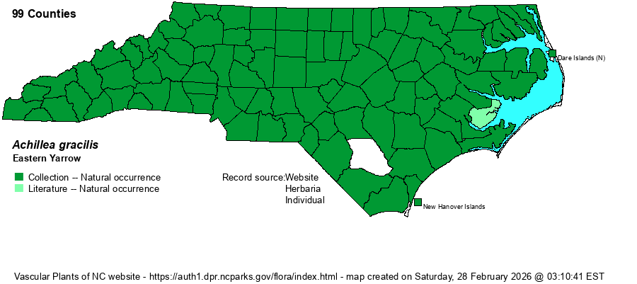 | Distribution | Throughout the state, certainly found in all 100 counties. Apparently, no one has bothered to collect or photograph it from Bladen County. Eastern Yarrow is one of our most widely distributed plant species, but it is scarce in poor sandy soils.