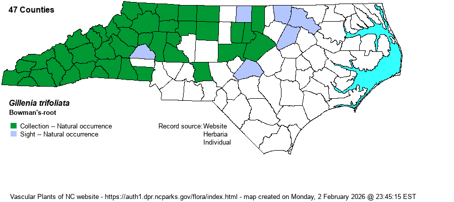 | Abundance | Common in the Mountains and foothills; frequent in the northwestern Piedmont, but only infrequent to locally fairly common in the rest of the Piedmont, but rare in the southeastern portions. | |