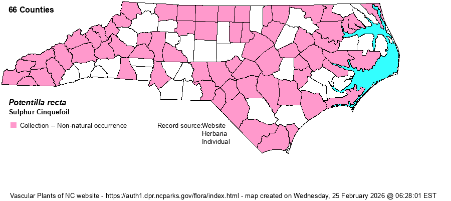 | Identification | Sulphur Cinquefoil is one of those favorite plants that folks think of as native. Stems are erect and up to 2 feet tall, hairy, with well-spaced 5-fingered leaves. The flowers are large for this genus, pale yellow -- as opposed to bright yellow in nearly all other NC members of the genus. | |