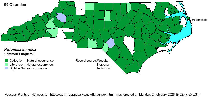| Identification | This and P. canadensis are similar species, both growing close to the ground and eventually becoming prostrate. This species can grow to 1-2 feet long, and it has basal and stem leaves that are 5-parted. Each leaflet is finger-like -- about 2 inches long, narrowly elliptic to oblanceolate, strongly toothed along the entire margin, and about 3-4 times longer than wide. P. canadensis has shorter leaflets, barely 1 inch long, wedge-shaped, and straight and untoothed on the lower half. Each has a bright yellow flower, with 5 petals (notched at the apex) and a flower spread about 1 inch across, at most leaf nodes. In this species, the lowest/first flower comes off the second node, as opposed to the first node in P. canadensis. However, the leaf shape should be suitable for identification, as this one has longer "fingers" that are completely toothed, whereas the other has short leaflets with straight and untoothed lower portions. | |