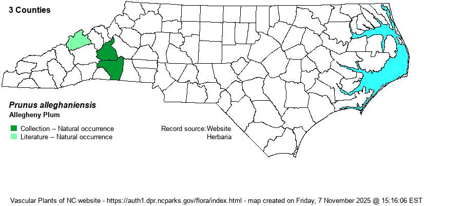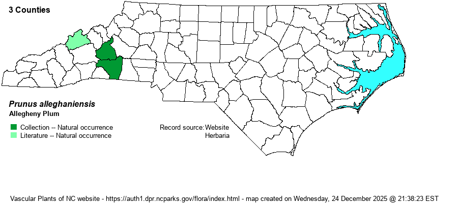| Identification | Only a very few biologists have seen this species in the state, and mostly those who have received permission to visit the privately owned Box Creek area in the South Mountains. This is a large shrub or very small deciduous tree, reaching only to about 15 feet tall, usually lower; it can have a straggling form and grow in thickets. Its leaves are lanceolate (wider near the base) to nearly elliptic, and sharply but minutely serrate. It has rather small white flowers about 1/2-inch across. Most importantly, it has purple or dark purple, rounded fruits about 1/2-inch across, which distinguish it from nearly all other woody Rose family species. If the fruits are not visible, it can be easily confused with Hog Plum (P. umbellata), though that species occurs lower in elevation in the foothills and Piedmont, does not occur in strongly circumneutral/basic soils, usually occurs singly and not in clumps, and is normally a small tree and not a straggly shrub. | |