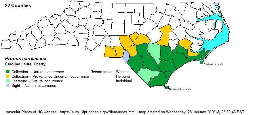 | Distribution | Restricted as a presumed native species to the southern Coastal Plain, north to southernmost Scotland and Cumberland counties (probably) and Jones County (certainly). This species is known to readily escape, and its native range in the state -– especially away from coastal counties -- and globally is speculative as a result. Thought to be essentially a maritime forest/thicket species in NC and thus the native range might have been limited to coastal counties. There are numerous specimens and iNaturalist photos that are not mapped, as either they cannot be confirmed by the website editors, or the naturalness of the location cannot be established. Even some of the counties where mapped in green as "Natural Occurrence" might be better mapped in orange as Provenance Uncertain, though almost certainly it is native to the southern coastal counties. All records from the Sandhills proper are of escaped/established plants.