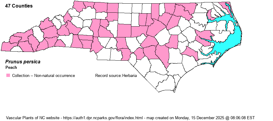 | Abundance | Fairly common in most of the state, but rare in the Coastal Plain. Website editors wonder if most NC records are of persisting trees, rather than actual established/reproducing plants. | |