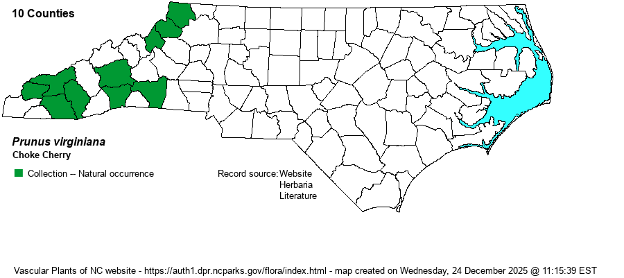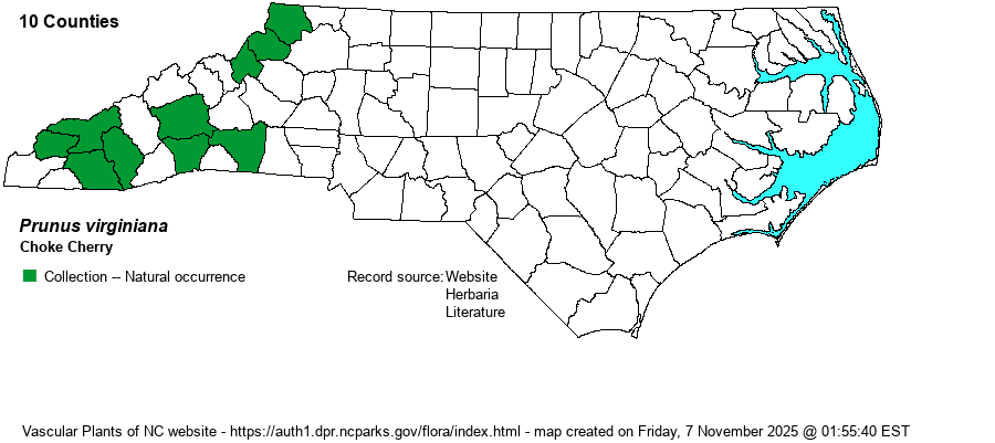 This is a Northern species of a wider range than any other Prunus found in the state. It occurs across most of Canada, south into Mexico and in all Western states. However, in the Southeast it ranges only down the Appalachians to northern GA.