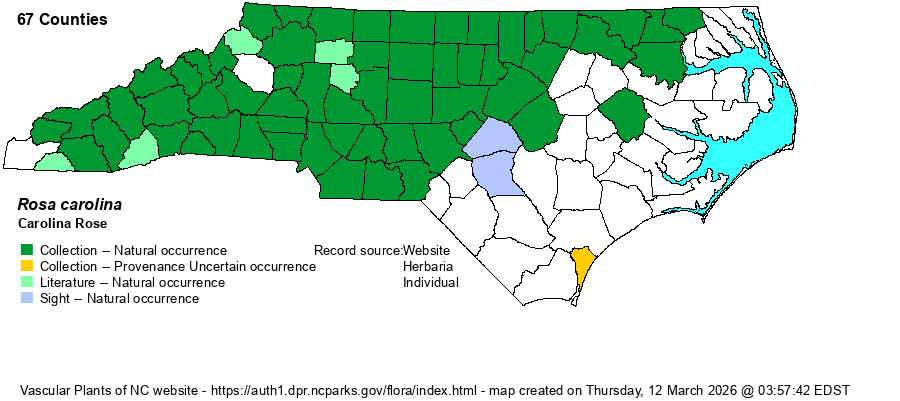 | Taxonomic Comments | This species has several subspecies named by some references, such as Weakley (2018); he lists not only the nominate subspecies for the state – R. carolina ssp. carolina, but also R. carolina ssp. subserrulata, rare in the mountains and Piedmont. However, subspecies are supposed to represent allopatric entities, not overlapping ones (as varieties can do). Thus, perhaps these should be listed as varieties.