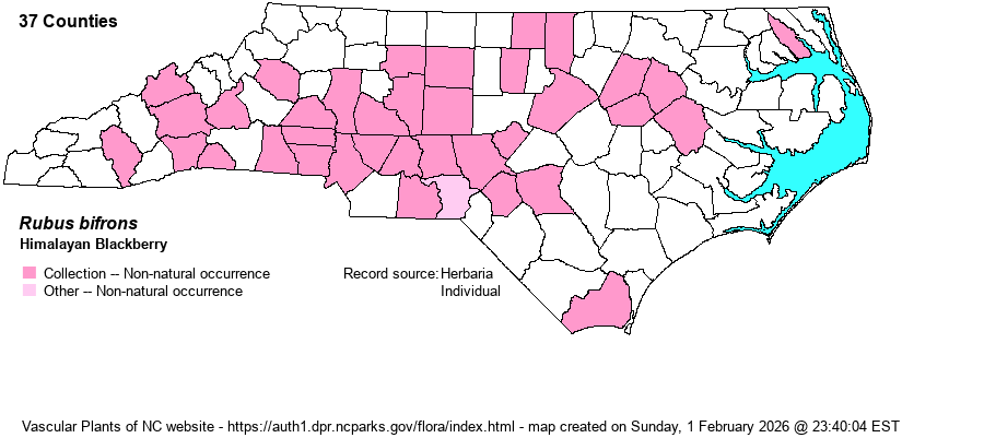 | Identification | Himalayan Blackberry has 3-5 broadly ovate leaflets per leaf; all are ashy gray beneath, the terminal one often rather orbicular. The canes are armed with numerous, relatively straight thorns and these extend right into the inflorescence. | |