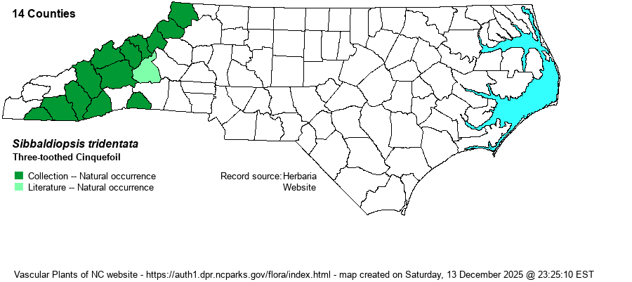 | Taxonomic Comments | The species was long included in Potentilla in the 20th Century, as P. tridentata. It was moved to Sibbaldiopsis tridentata, and now to Sibbaldia retusa by most recent authorities. However, its final resting place is still not settled; see Weakley (2020), who moved it back to S. tridentata.