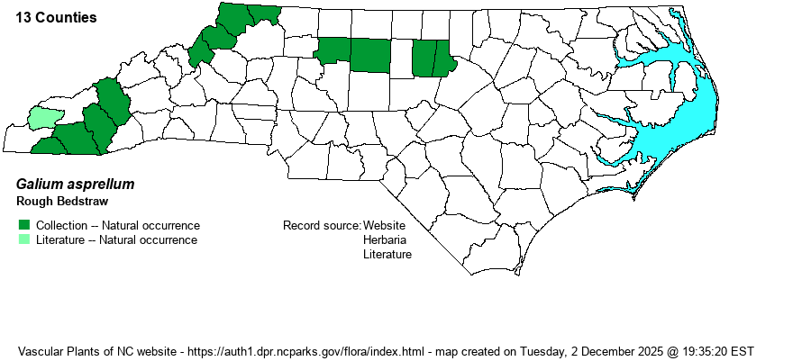 | Identification | This is a much-branched herb with weak stems, typically leaning on other vegetation or forming mats near the ground; it reaches 3-5 feet long. As with G. aparine, this species has retrorse (backward-pointing) stiff hairs along the stem, rough to the touch. Unlike that species, it has just 5-6 leaves in a whorl at each node; the leaf is elliptical, about 2/3-inch long and barely 1/4-inch wide. The clusters of small white flowers are in leaf axils, though most are concentrated toward the outer part of the stem. This is the most "bushy" looking of our native species, with numerous branches. However, to see it in the state you will need to look in the northern mountains, in sunny wet or damp places. | |