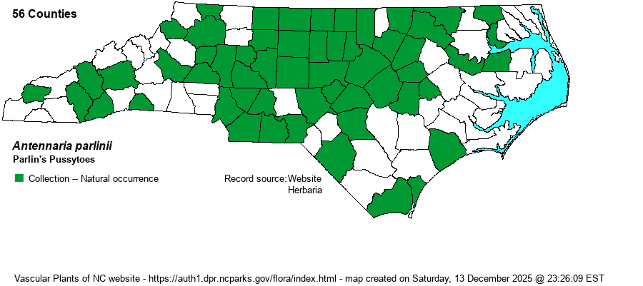 | Identification | Both subspecies of A. parlinii have 3-5 prominent nerves on the basal leaves, as opposed to Howell's Pussytoes (A. howellii) and Field Pussytoes (A. neglecta), which both have just one. From Plantain-leaf Pussytoes (A. plantaginifolia), Parlin's differs in its taller female florets and floral bracts (involucres), and taller male florets -- see Weakley (2024) for details. In addition, Plantain-leaf Pussytoes is densely hairy on the upper surfaces of leaves (vs. glabrous or hairy only when young in Parlin's Pussytoes). | |