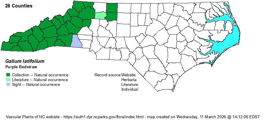 | Identification | This is an erect to leaning herb, mostly unbranched, growing to about 1.5 feet tall. The stems are generally smooth. The leaves are in whorls of 4; they are rather large for members of the genus, being lanceolate and about 2 inches long and 3/4-inch wide, with a long tapering tip that is often acuminate in shape. The inflorescences are only from the upper few whorls, in quite large and branched clusters. The purple or maroon flowers are on pedicels, which differentiates it from the similar G. lanceolatum, which has sessile whitish to cream colored flowers on mostly terminal, long flowering stalks with sessile flowers. The capsules are dry and smooth, not spiny/bristly as in the other species. However, when no flowers or fruit are present, be careful in the identification, though this species normally has more tapering leaves with narrower tips. | |