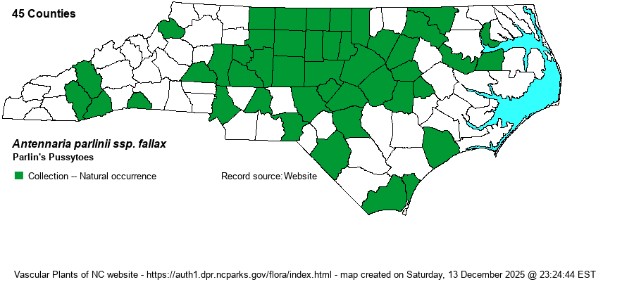 | Antennaria parlinii ssp. fallax | = | Antennaria plantaginifolia var. ambigens | Vascular Flora of the Southeastern States (Cronquist 1980, Isely 1990) | |