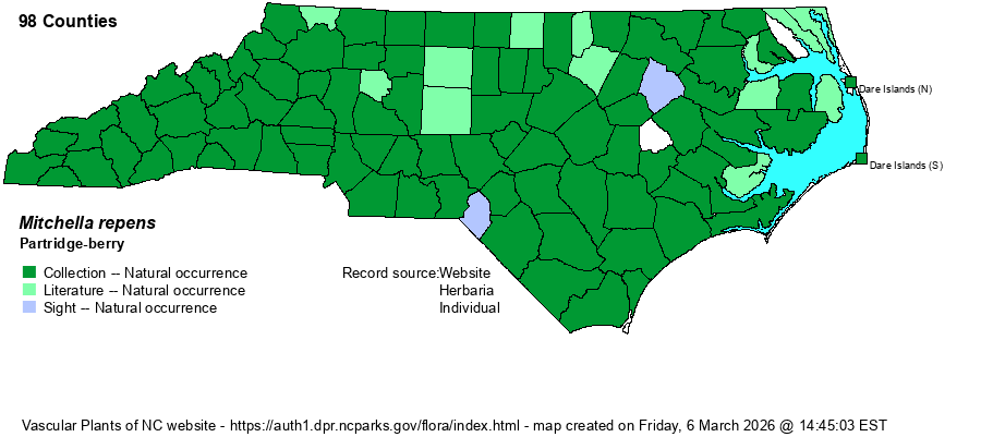 | Identification | This is a very familiar and completely unmistakable plant. It has a creeping stem and evergreen leaves, on a stem to about 8 inches long, rooting at nodes. The small rounded leaves, about the size of a fingernail, are opposite, leathery, and dark green. The flowers are twinned, in pairs with a single united ovary. Each flower is tubular, white, about 1/2-inch long, with 4 flared lobes that are fuzzy on the inside. A single red berry forms soon after flowering at each pair of flowers. This is a species that can practically be seen on any woodland walk in most of the state. | |