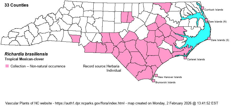 | Identification | Tropical Mexican-clover is a perennial from a long taproot, with ascending to sprawling branched stems. The leaves are opposite, lance-shaped or elliptical, pointed, with impressed veins on the upper side. The flowers grow in dense terminal clusters, petals usually 6, white. It is very similar to R. scabra, but the leaves are hairy on both sides across the whole surface (vs. hairy only on the midrib and margins). The stems in this species are quite hirsute throughout their length; in R. scabra they are hirsute mostly near the tips, and are progressively less hairy toward the base. Both species have similar ranges in the state and are both reasonably common and often found. | |