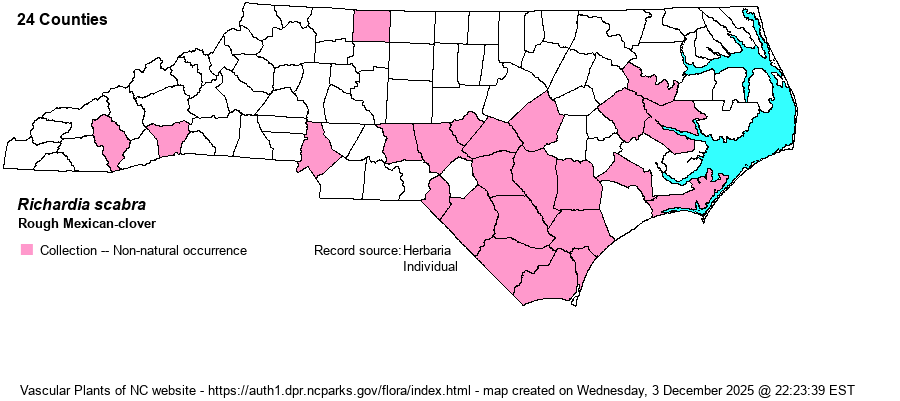 | Identification | Rough Mexican-clover is very similar to R. brasiliensis, which see. It differs by the leaves which are hairy only on the midrib and margins (vs. hairy on both sides across the whole surface). The stem in this species is hirsute only near the tips, but mostly glabrate to progressively less hairy toward the base; R. brasiliensis has the stems quite hirsute throughout their length. | |