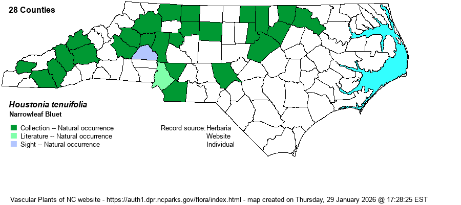| Abundance | Uncommon as a whole in the Piedmont and Mountains, but is locally fairly common in the northeastern Piedmont and again in the northwestern Piedmont, including the Brushy Mountains. It seems to be absent in the northern Mountains and is locally quite scarce in parts of the Piedmont. As NatureServe (= BONAP) does not consider it valid, even as a variety (!), the website editors have assigned a recommended Global Rank of G5. | |