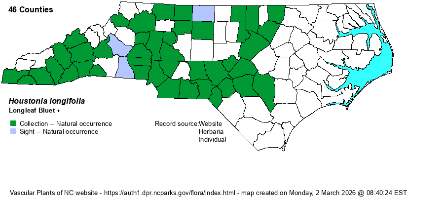| Distribution | Scattered over most of the Mountains and Piedmont, and sparingly into the southwestern Coastal Plain, including in the Sandhills region. NOTE: Neither RAB (1968) nor NCU specimens verify records from the northeastern Piedmont. Thus, the cluster of records for the 6-county region from Person to Warren and south to Wake may refer to misidentified specimens of H. tenuifolia. They are retained on the range map only because the range in VA shows on the Digital Atlas of the Virginia Flora as occurring in nearly all counties in southern VA along the NC state line. Thus, the northeastern piedmont is surely within the overall species range.