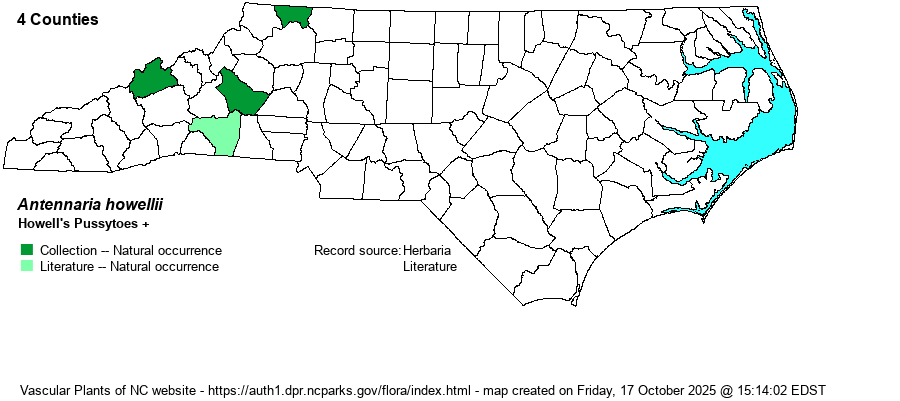 Identification | Howell's Pussytoes grows 6 inches to a foot tall from a basal rosette of leaves, and often also with leafy stolons radiating out from the base. Leaves are oblanceolate or like a spatula, 1-veined, dull brownish green above and densely pale gray hairy beneath. Stem leaves are linear and pointy. Our only other pussytoes with 1-veined leaves is A. neglecta, which has upper surfaces of the leaves gray-hairy. | |
