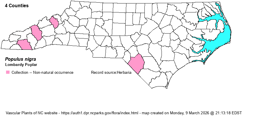 | Abundance | Very rare as an escape, though often seen planted along field margins and yard borders to act as windbreaks. Apparently our plants are all male and reproduce by root suckers. | |